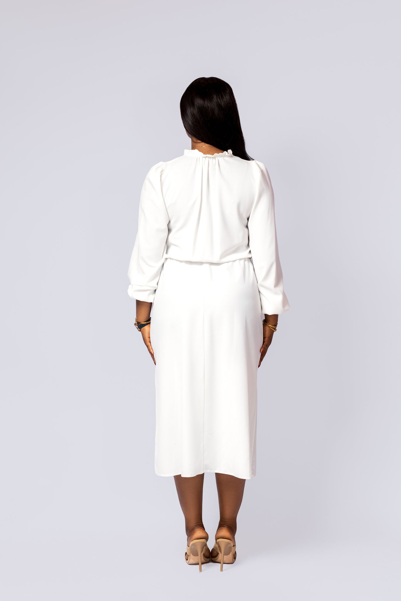 Get ready to turn heads in this elegant white cotton dress! With a slight v neck cut and falling just below the knee, this dress is perfect for any occasion. Add a touch of sophistication to your wardrobe today!
